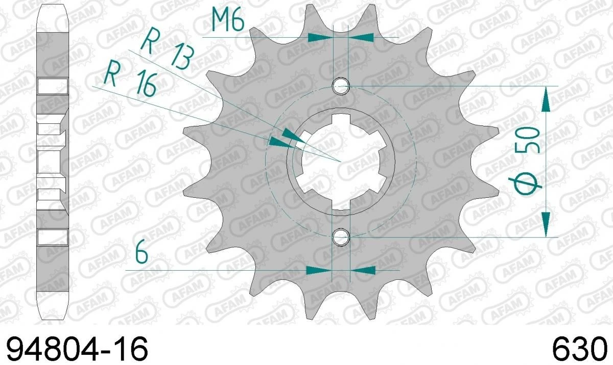 Een stalen 16 tands AFAM voortandwiel. De tandwielen van AFAM zijn gemaakt van C45 staal met inductie geharde tanden, het tandprofiel is concentrisch, plat en perfect rond. Door deze samenstelling zijn de AFAM tandwielen perfect ter vervanging of zelfs ter verbetering van de OEM tandwielen.