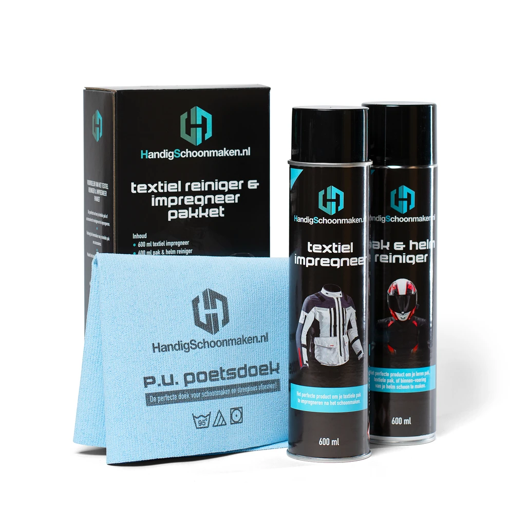 Met deze set heb je alles in huis om je textiele motorkleding te reinigen en impregneren. Het werkt gemakkelijk en je bent in een paar minuten klaar. Dankzij het onderhoud verleng je de levensduur van je kleding en zorg je dat het er mooi uit blijft zien.