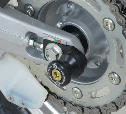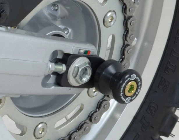 Wanneer er geen schroefdraad in de achterbrug is om een bobbin te monteren kan de R&G “Offset Cotton Reels” gebruikt worden. Zo kan er via de kettingspanner/achteras toch een bobbin op de motor gemonteerd worden en kan de motor dus met een paddockstand veilig en stevig gestald worden. Ook beschermen de bobbins de achterbrug bij een val.