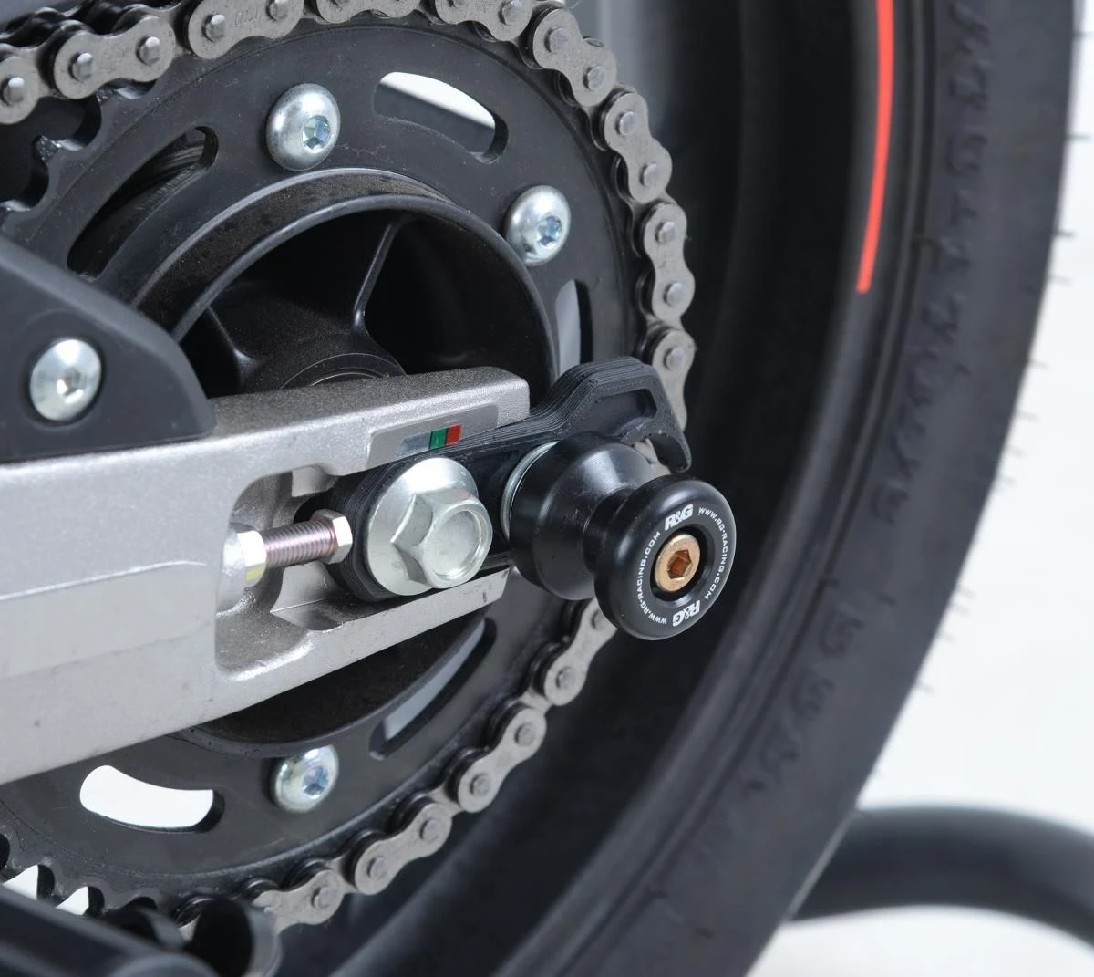 Wanneer er geen schroefdraad in de achterbrug is om een bobbin te monteren kan de R&G “Offset Cotton Reels” gebruikt worden. Zo kan er via de kettingspanner/achteras toch een bobbin op de motor gemonteerd worden en kan de motor dus met een paddockstand veilig en stevig gestald worden. Ook beschermen de bobbins de achterbrug bij een val.